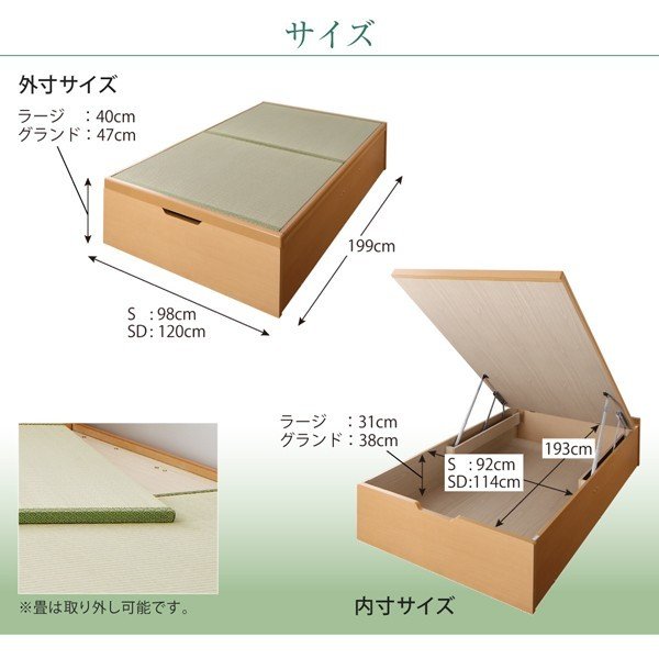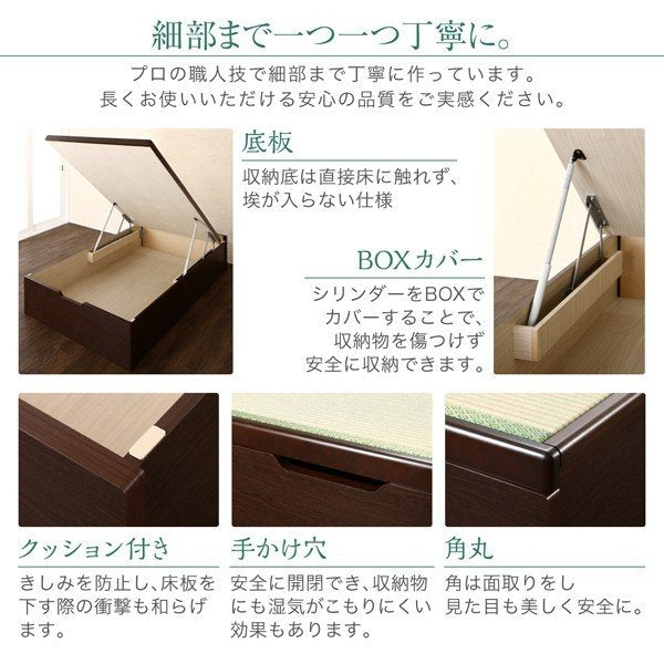 kag-49455 セミダブルベッド 一人 フレーム 跳ね上げ式 ガス圧 ベッド下 収納付き 国産 日本製 畳 硬め 布団対応 布団用 腰痛 通気性 カビ 湿気 和室 ヘッドレス アジアン