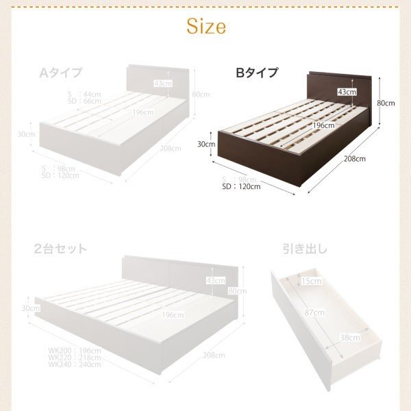 セミダブル:(約)幅120x長さ208x高さ80cm