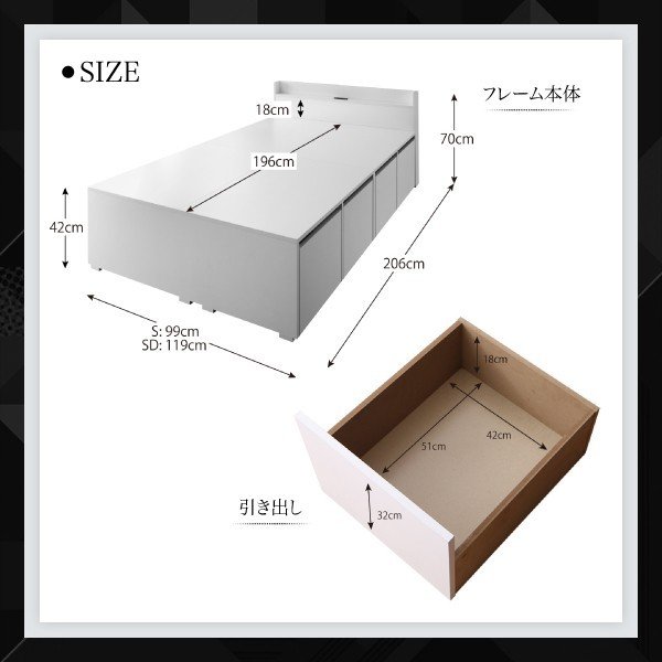 セミダブルベッド 一人暮らし SD マットレス付き チェストベッド ミドル ベッド下収納 引き出し付き 大容量 宮付き ヘッドボード 枕元 棚 ラック 携帯置き ティッシュ置き メガネ置き リモコン 頭上 収納 コンセント ゲーム ケーブル スマホ 充電 電気 布団 直置き マットレス不要 フラット床板 土台 箱型 デザイナーズ ホテル モダン 高級 メンズ
