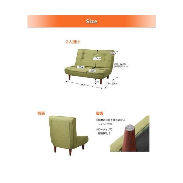 2人掛け:幅約121 奥行き78~122 高さ30.5~82cm(座面高30.5cm)