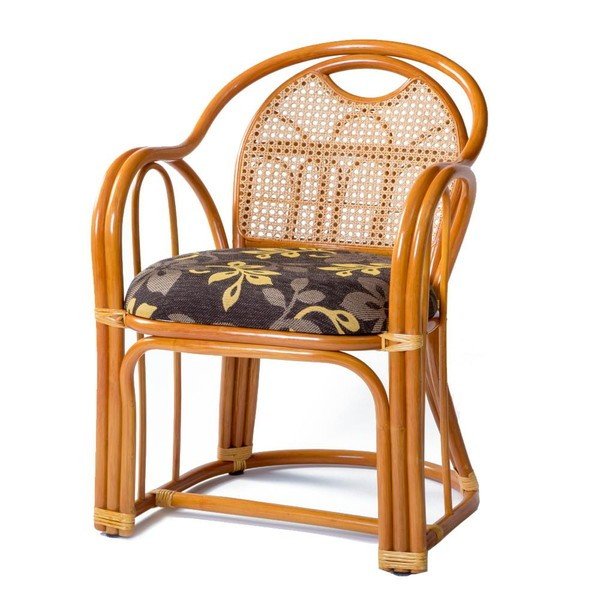 座っている時も、立ち上がる時もラクな肘掛付です。背面は丈夫なカゴメ編みで、雑誌や小物を収納できるラック付。持ち運びも楽な作りになっています。