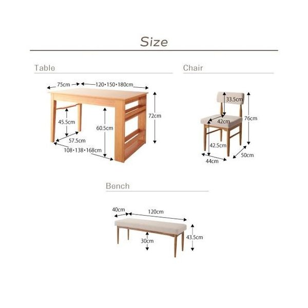 当商品は4点(机+チェア2脚+ベンチ1脚)幅120-180
