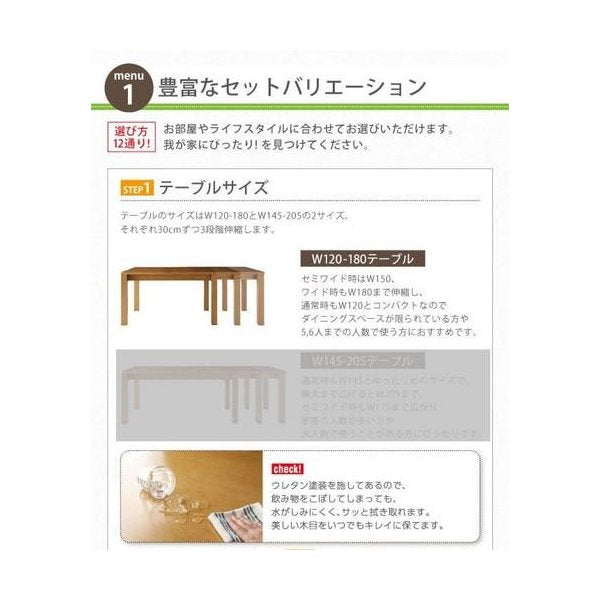 当商品は6点(机+チェア4脚+ベンチ1脚)幅120-180