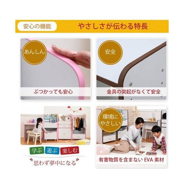弾力性、衝撃吸収に優れたEVA樹脂をすべてのフチに採用。さ角を丸くして金具の使用を極力減らした、小さなお子様も安全にご使用いただけるです。6段階の高さ調節ができるので、お子様の成長に合わせて長くお使いいただけます。