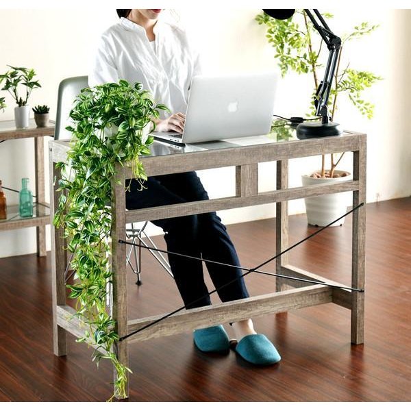 優しい色調で味わい深い古木風シートと美しい強化ガラスを組み合わせたデザインが、お部屋全体にすっきりとした印象を与えるデスク。圧迫感のないシンプルなデザインは、お気に入りの小物や観葉植物、ドライフラワーなどを一層際立たせてくれます。強化ガラスは8mmと厚く、作業するにも安心です。学習や仕事にはもちろん、趣味を楽しむワークデスクとしても気分を盛り上げてくれるデザインです。