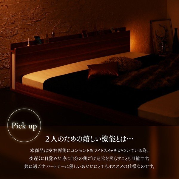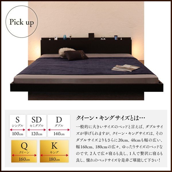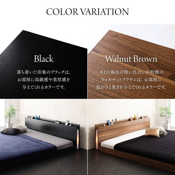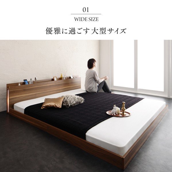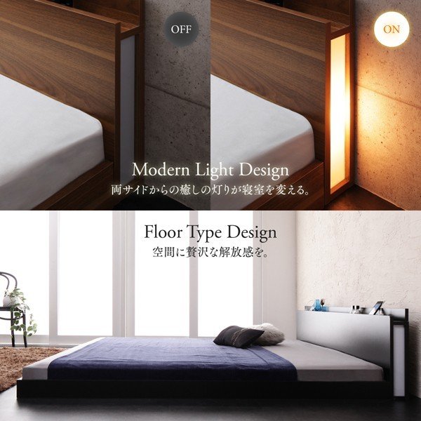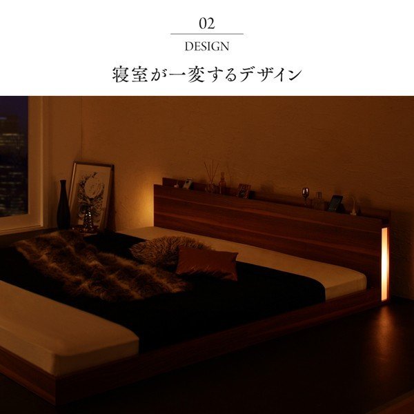 kag-53571 キングベッド 家族 ファミリー 親子 ワイド マットレス付き ローベッド 低い 宮 棚 携帯 リモコン 収納 照明 読書 ライト 電気 コンセント スマホ 充電