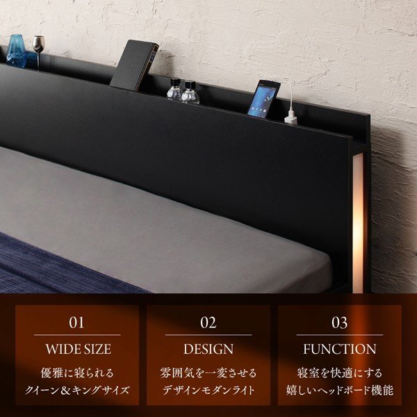 キングベッド 家族 ファミリー 親子 ワイド マットレス付き ローベッド ロータイプ フロア 低床 低い 宮付き ヘッドボード 枕元 棚 ラック 携帯置き ティッシュ置き メガネ置き リモコン 頭上 収納 照明 読書灯 ライト 読書 電気 コンセント ゲーム ケーブル スマホ 充電 デザイナーズ ホテル モダン 高級 メンズ