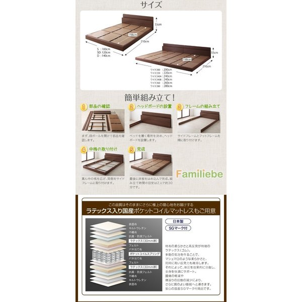 kag-44320 連結ベッド 幅220 キング ワイド 3人 4人 家族 つなげる 2台 分割 ファミリー 親子 マットレス付き ローベッド 低い 宮 棚 携帯 収納 コンセント スマホ 充電