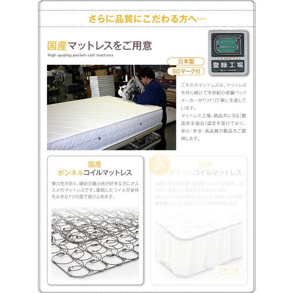 2.1mmコイルスプリング(コイル数/ S:270 SD:330 D:390)、2.2mmコイルスプリング(コイル数/ S:92 SD:98 D:104)、ウレタン、フェルト、ポリエステル張地、両面多針キルティング加工