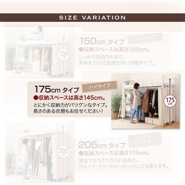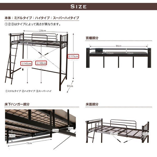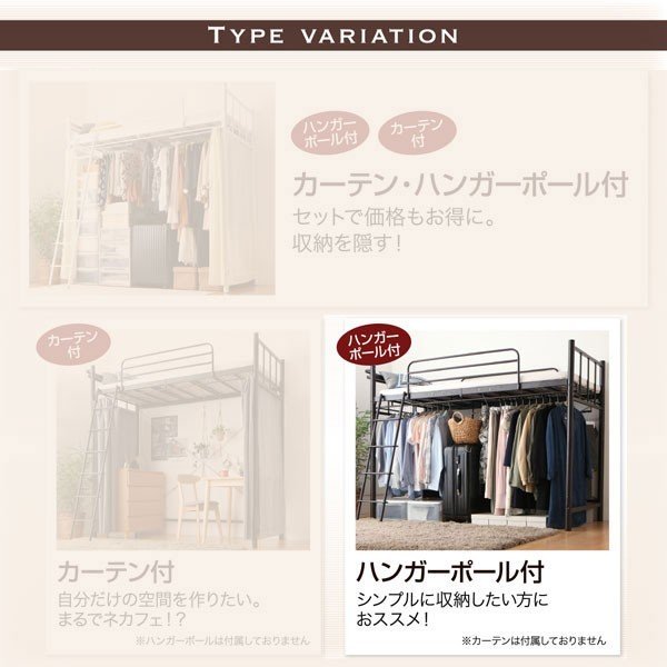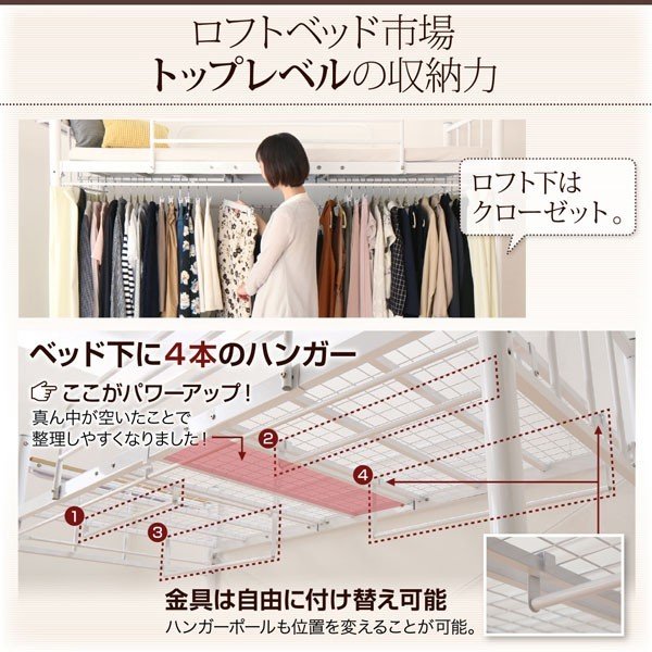 kag-44601 ロフトベッド シングル 一人 フレーム ハイタイプ システム 頑丈 子供部屋 クローゼット パイプベッド アイアン スチール 金属 棚 携帯 収納 スマホ コンセント