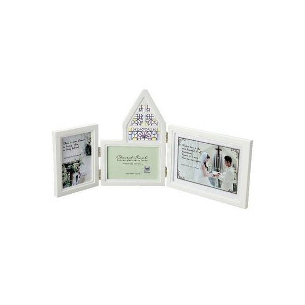 愛らしいレッドと、爽やかなブルーのステンドグラス。白い教会をイメージした2種類のウェディングフォトフレーム。