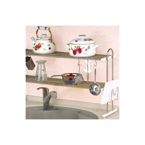 組み立てて置くだけ!!キッチンの整理に便利な収納棚です。設置場所に合わせて、幅を伸縮することができます。錆びに強く清潔なステンレス製。ふきん掛け、フック、角ポケット、まないた受けもセットになっているので、台所まわりがすっきり片付きます!!