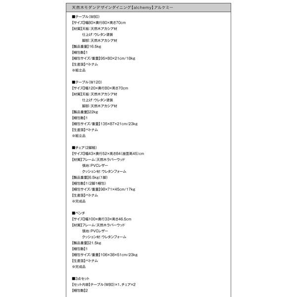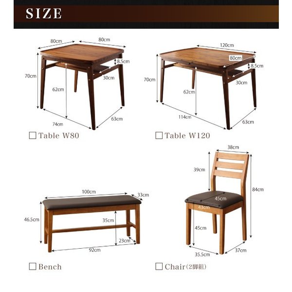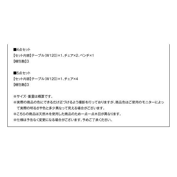 【セット内容】テーブル(W120) 1、チェア 2、ベンチ 1