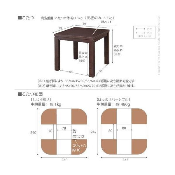 幅80x奥行80x高さ45/50/55/60/65/70cm(継ぎ脚10cmx2個、5cmx1個)