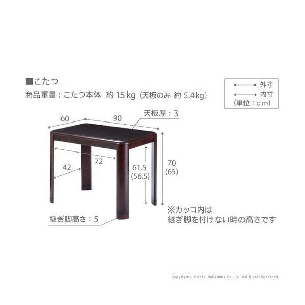 幅90x奥行60x高さ70/65cm(継脚5cm)・約15kg、天板厚み:30mm