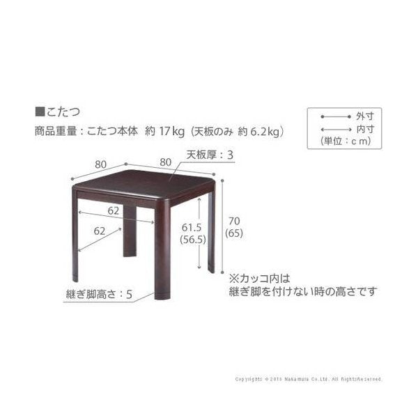 幅80x奥行80x高さ70/65cm(継脚5cm)・約17kg、天板:厚み30mm