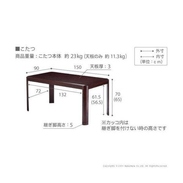 幅150x奥行90x高さ70/65cm・約23kg、天板:厚み30mm