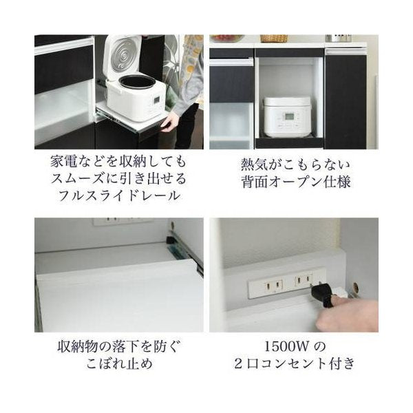 家電の収納に便利なコンセント付きスライド棚と、収納物に合わせて高さ調節ができる可動棚付きの食器棚をこれ1台で。ロータイプは天板も使いやすいちょうど良い高さ。キッチンのちょっとした隙間に設置すれば、それまでのデッドスペースを有効活用できます。