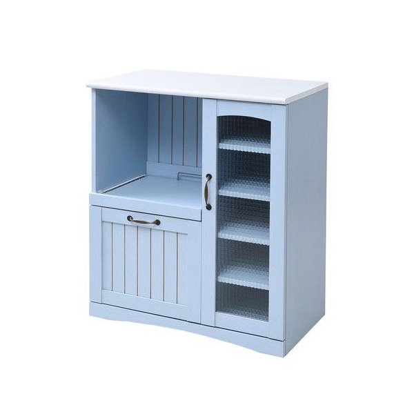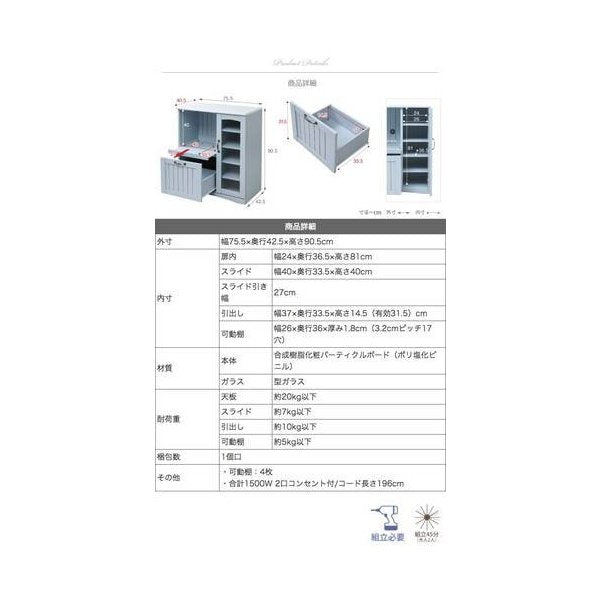 バイで魅せるフレンチカントリースタイルのキッチンカウンター。コンパクトサイズなので一人暮らしにも最適。スライド棚のついたスペースは2口コンセント付で、炊飯器やポットなど調理家電の収納に最適。深めの引出はペットボトルの収納も可能です。ガラス扉収納の中は、可動棚で収納物に合わせて高さを自由に変えられます。丸みを帯びたフォルムと、アンティーク調の取っ手といったディテールがカントリーテイストを漂わせます。