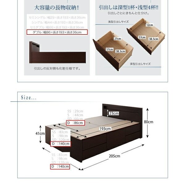 kag-4366 ベッド ダブル チェストベッド 下収納 引き出し 大容量 全面収納 棚 携帯 スマホ メガネ リモコン ラック 宮付き コンセント 充電 フレーム おしゃれ モダン